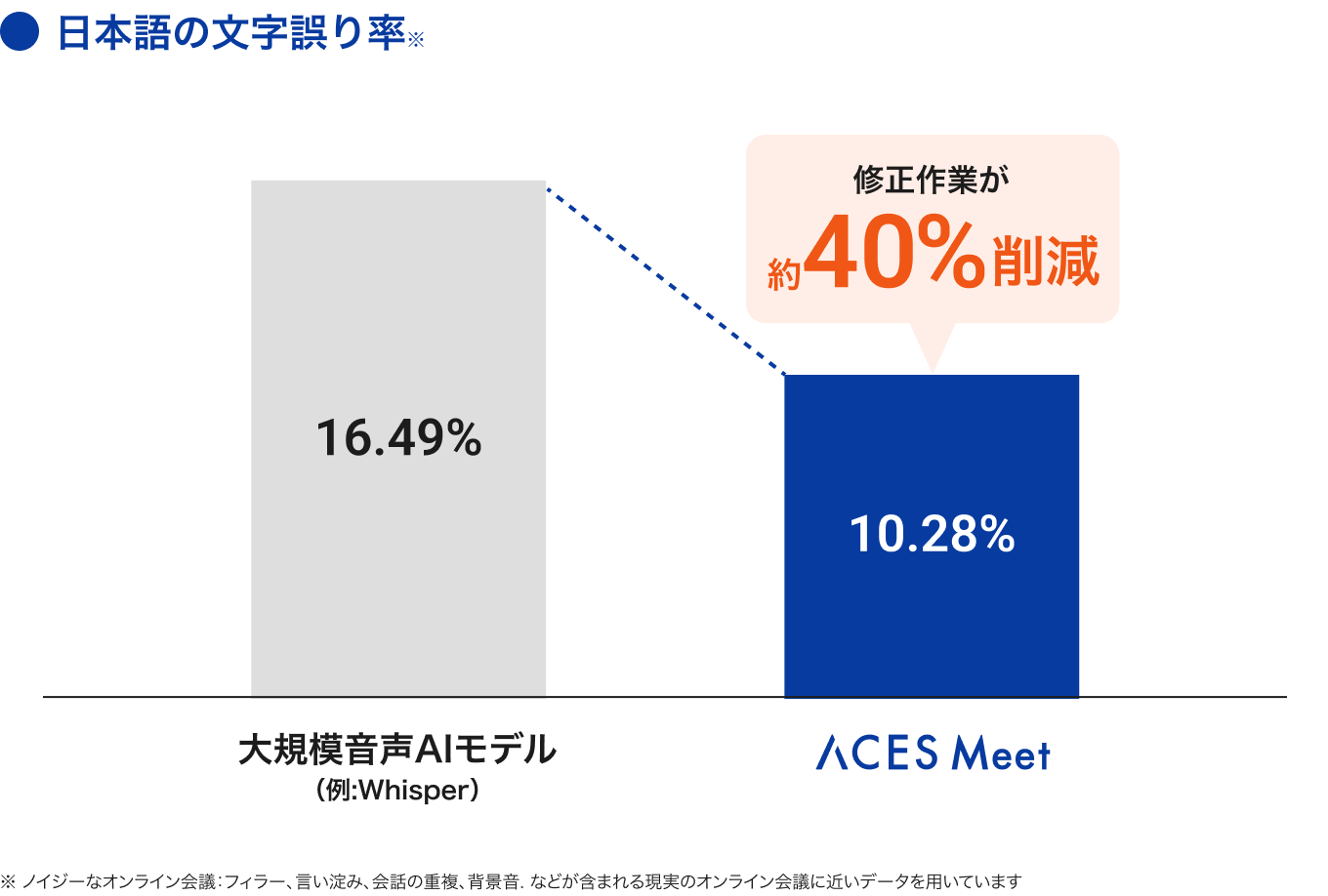 あらゆる会議を正確に記録・構造化LLM技術を応用した音声認識モデルに比べて、文字起こしの修正が必要な箇所は約40%削減。議事録を”そのまま共有できる”精度を実現しています。